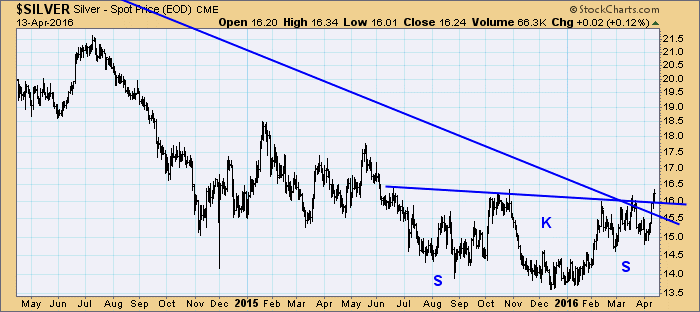 Wie Sie auf dem folgenden Chart sehen, hat der Silberpreis gerade die massive Widerstandsmarke von 16 $ pro Unze hinter sich gelassen. Aus charttechnischer Sicht ist das der Ausbruch aus einer schönen Schulter-Kopf-Schulter-Bodenformation (SKS im Chart). Damit ist jetzt auch bei Silber der Weg nach oben frei. Viel wichtiger noch: Mit diesem Ausbruch nach oben
