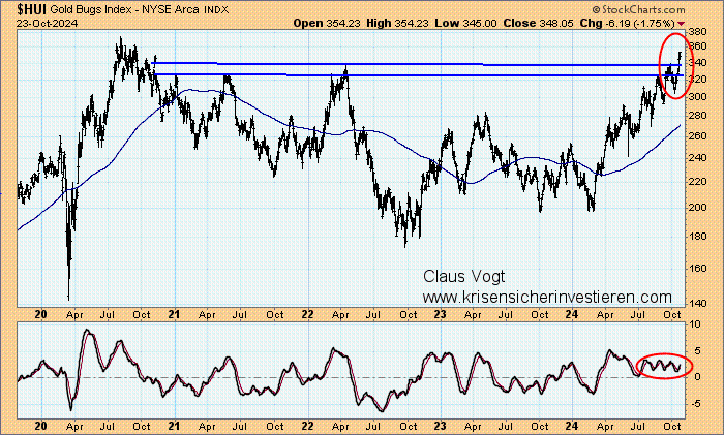 Nun haben die Goldminenaktien charttechnisch ein sehr wichtiges Signal gegeben. Wie Sie auf dem folgenden Chart erkennen, ist HUI Gold Bugs Index in der vergangenen Woche aus einer langen Bodenformation mit Schwung nach oben ausgebrochen. Dieses Signal wird durch den im Chart rot eingekreisten Preis-Momentum-Oszillator untermauert, der sich trotz des jüngsten Kursanstiegs noch im neutralen Bereich befindet und weit entfernt von überverkauften Werten ist.