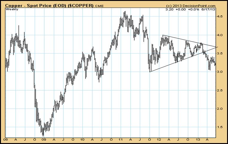 Wie Sie auf dem Chart sehen, ist der Kupferpreis bereits im März dieses Jahres aus einer großen Dreiecksformation nach unten ausgebrochen. Damit signalisiert die Charttechnik eine Fortsetzung des Abwärtstrends. Mit einem Aufschwung in den USA beziehungsweise der Weltwirtschaft passt diese Entwicklung nicht zusammen.