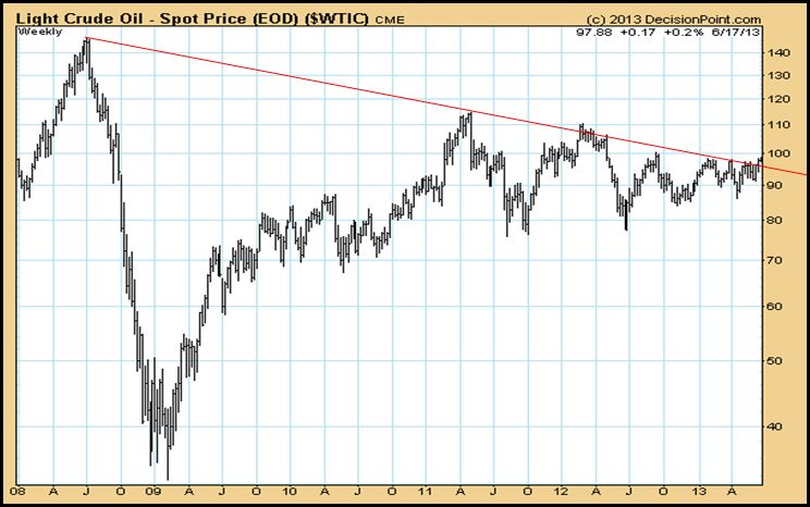 Im Unterschied zu Kupfer hat der Ölpreis gerade ein charttechnisches Kaufsignal gegeben. Im Wochenchart sehen Sie, dass er seine aus dem Jahr 2008 stammende Abwärtstrendlinie gebrochen hat. Und auf dem hier nicht gezeigten Tageschart sieht man, dass gleichzeig ein Ausbruch aus einer einjährigen Dreiecksformation nach oben stattgefunden hat. Diese Signale deuten auf einen steigenden Ölpreis hin.